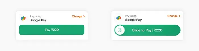 Приняв эти меры, мы были готовы поэкспериментировать с кнопкой-слайдером для быстрого оформления заказа. И вуаля! 🎉 После анализа данных стало ясно, что кнопка-слайдер добавляет "здоровое взаимодействие", чтобы избежать случайных нажатий, не влияя при этом на общее общение пользователей. Теперь для всех наших пользователей Swiggy работает функция быстрого оформления заказа с использованием слайдера для оплаты.