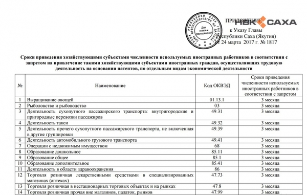 Таким образом, на территории Якутии запрещена деятельность иностранных граждан в рыболовстве, сельском хозяйстве, такси, грузоперевозке, в торговле и других сферах.