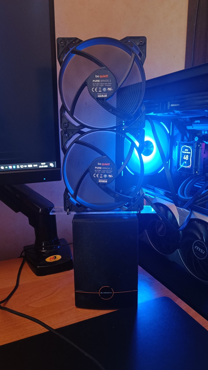 Дома стало жарко. Сидел листал маркетплейсы на предмет настольного небольшого, но мощного вентилятора для обдува хлебальника. Потом подумал - а нахрена? У меня в ящике лежат штук шесть кулеров после апгрейдов. На материнке шесть мест куда их можно подключить, занято только два. Десять минут времени, четыре стяжки, кусок поликарбоната и силиконовый двухсторонний скотч. Вуаля. Места не занимает совсем.