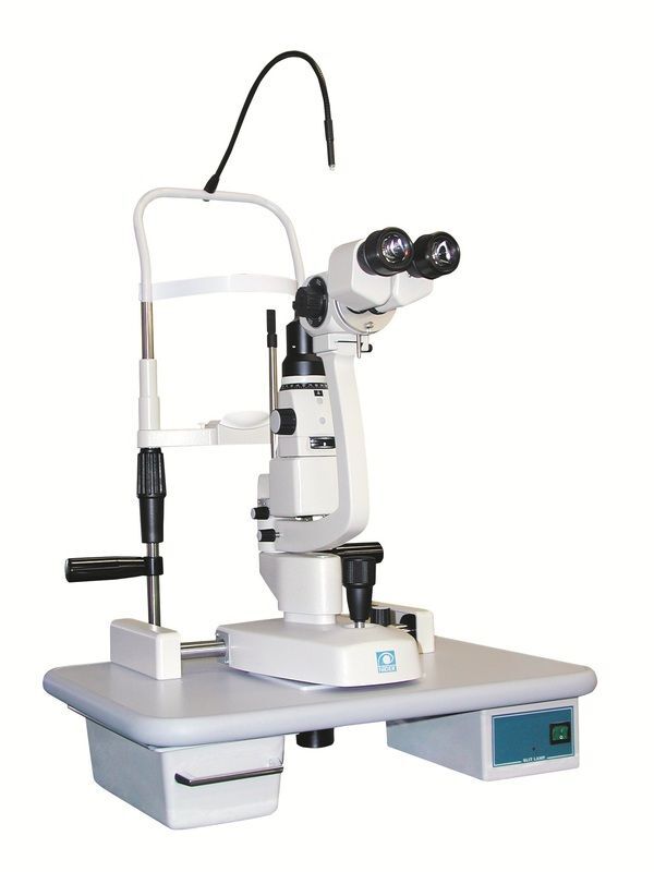 Полет домой занимал около часа и глаз к этому моменту уже нестерпимо жёг. А так как на глаза я никогда не жаловался, то переживал знатно. В голову лезло всякое: от ухудшения зрения до полной его потере. Поэтому по прилете в родной город (где-то после полуночи) и на всякий сразу же зашел в медпункт местного аэропорта. Но там из приборов для осмотра глаз не было даже фонарика, только настольная лампа. Зато я получил рекомендацию в какую больницу можно обратиться ночью. Обычный травмпункт не подходил, так как мне нужен был профессиональный офтальмологический прибор (типа как на картинке)