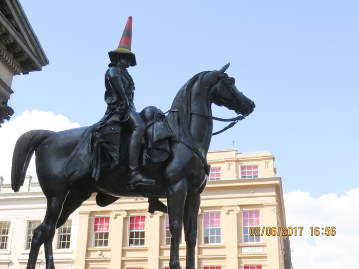 У герцога Веллингтона в Шотландии какая-то странная популярность. В Эдинборо на него социалисты вешают свои плакаты, в Глазго народ вот так вот заботится о головном уборе.