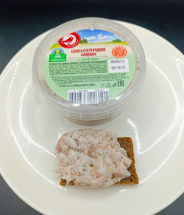 Это просто любовь с первого укуса, на полке было 3-4 вида такого сала с разными добавками, зелень показалась мне самой безопасной в плане вкусовых изменений. Помол крупный, но во рту тает мгновенно, чувствуется ненавязчивая зелень и тмин, в меру солёное. Мой холодильник не долго хранил эту баночку, нужно ещё купить.