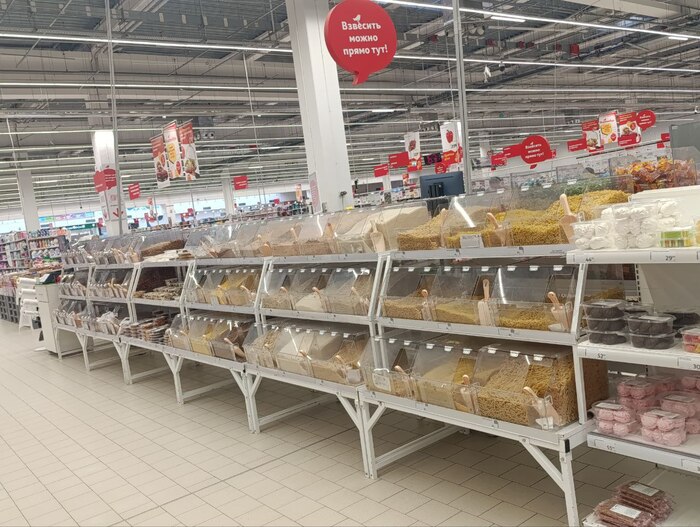 В этой паузе хочу рассказать о своей небольшой радости, мне очень нравятся продукты на развес, да я знаю, что не гигиенично, мыши ссали, воробьи летали, бабки проклинали... Но для меня это классный формат. Года 2 назад я была в другом "Ашане" и оттуда убрали крупу, муку, печенья на развес и я была уверена что теперь везде так, ан нет, тут всё по прежнему.