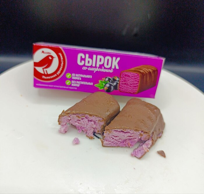 Я клюнула на упаковку как у Б.Ю. Александров и цену как в "Семишагофф". Приятная творожная масса с характерной для черной смородины кислинкой, для этой цены совсем неплохо. Скорее всего взяла бы ещё раз.