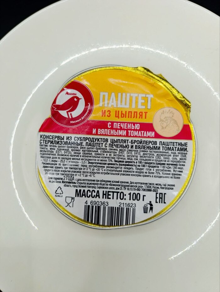 Вяленые томаты - серьёзная заявка для паштета за 50 рублей, посмотрим. По текстуре продукт похож на кусок маргарина, это не паштет в правильном его понимании, вялеными томатами и не пахнет, жирный, не сбалансированный по специям, даже 50 рублей для него много. Совсем не советую.