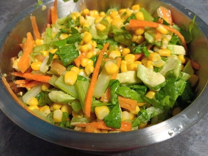 Морковь, сельдерей - тонко нарежьте, авокадо - кубиками, романо - нарежьте. Тщательно смешайте морковь, романо, сельдерей, кукурузу и сок лайма в миске. Затем добавьте авокадо и аккуратно перемешайте. Уберите в холодильник.
