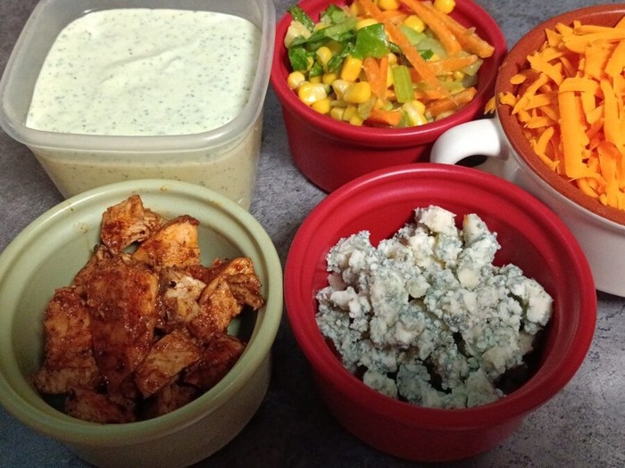 На тортилью выложите чеддер и немного растопите в духовке или микроволновке. Затем добавьте курицу, топпинг из авокадо и кукурузы, ранч с голубым сыром, раскрошенный голубой сыр и сбрызните свежевыжатым соком лайма.