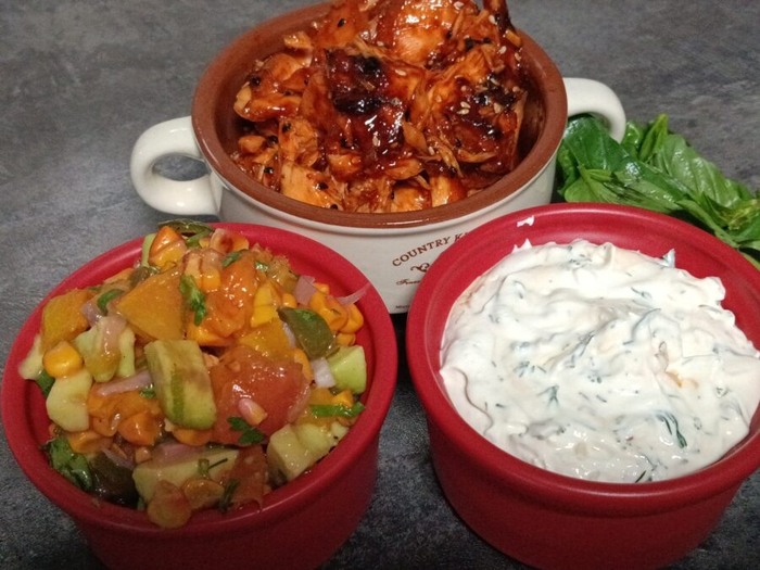 Лосось в маринаде барбекю и в азиатской барбекю глазури. Сладко-острая сальса с запеченными персиками и кукурузой. И нежнейший, сливочный спред с с фисташками и медом.