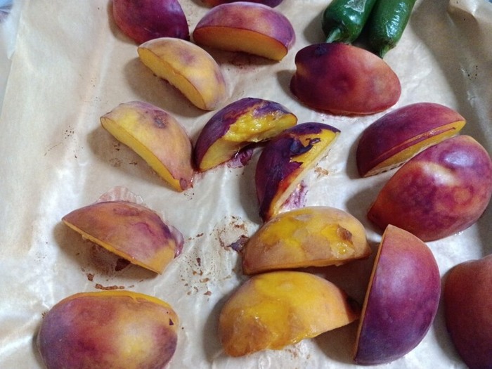 Подготовьте персиковую сальсу. На противень выложите нарезанные персики, початки кукурузы, халапеньо и лук шалот. Запекайте при температуре 200C 10-15 минут, затем переключите на гриль и запекайте до легкого обугливания халапеньо, 3 минуты.