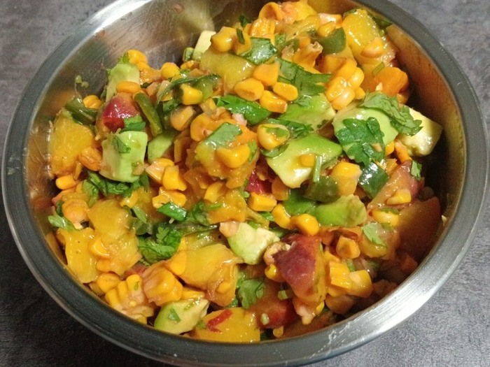 Початки кукурузы смажьте сливочным маслом и пожарьте на гриле. Дайте немного остыть. Снимите зерна с кукурузы, персики (кожу можно снять) нарежьте кубиками, халапеньо ломтиками и полукольцами лук шалот. Переложите в миску и добавьте авокадо, кинзу, сок и цедру лайма, тщательно перемешайте. Уберите в холодильник.