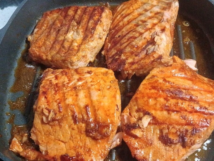 Разогрейте сковороду или сковороду гриль с небольшим количеством оливкового масла и обжарьте лосося с одной стороны до коричневой корочки, 4 минуты. Переверните, полейте отложенной глазурью и жарьте еще 5-7 минут (внутренняя температура 57C).