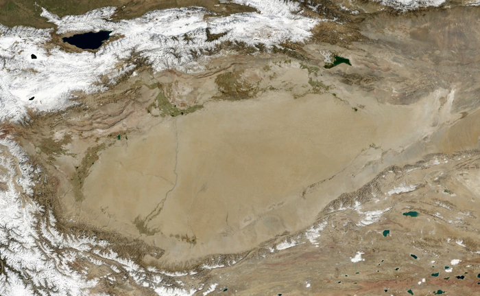 По всей видимости пустыня Такла-Макан - это след от падения крупного космического тела.Взрывную волну так же отчетливо видно. На рис.2 видно место падения космического тела - стрелки указывают направления ударной волны