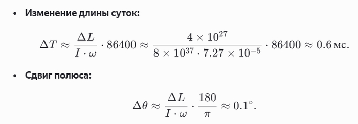Δω/ω ≈ 7 × 10⁻¹⁰ → изменение периода суток < 0,1 мс; соответственно, мгновенный сдвиг оси вращения: Δθ≈ωΔω⋅π180⋅3600≈0.002′′ ≤ 0,002″ дуги (миллионные доли градуса).