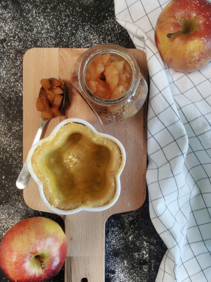 Пока готовится основа, приготовим начинку, для этого очистим 4 яблока и порежем на маленькие кубики, положим их в сотейник вместе с сахаром, сливочным маслом, по желанию корицей и мускатным орехом, с ними вкуснее). Вместо обычного сахара я добавила панелу (тростниковый сахар), она придала яблокам карамельный вкус. Ставим на средний огонь и доводим до кипения, яблоки сочные и сливочное масло начнет плавиться, поэтому жидкости вполне хватит, после кипения ставим на минимальный огонь и ждём, когда яблоки станут мягкими, на этом этапе можно выключать. Этой начинки у меня хватило на два порционных пирога, поэтому если у вас форма примерно 20 см умножайте количество ингредиентов на 2-3 раза, а вот теста оказалось в достатке и его вполне хватит на 20 см.