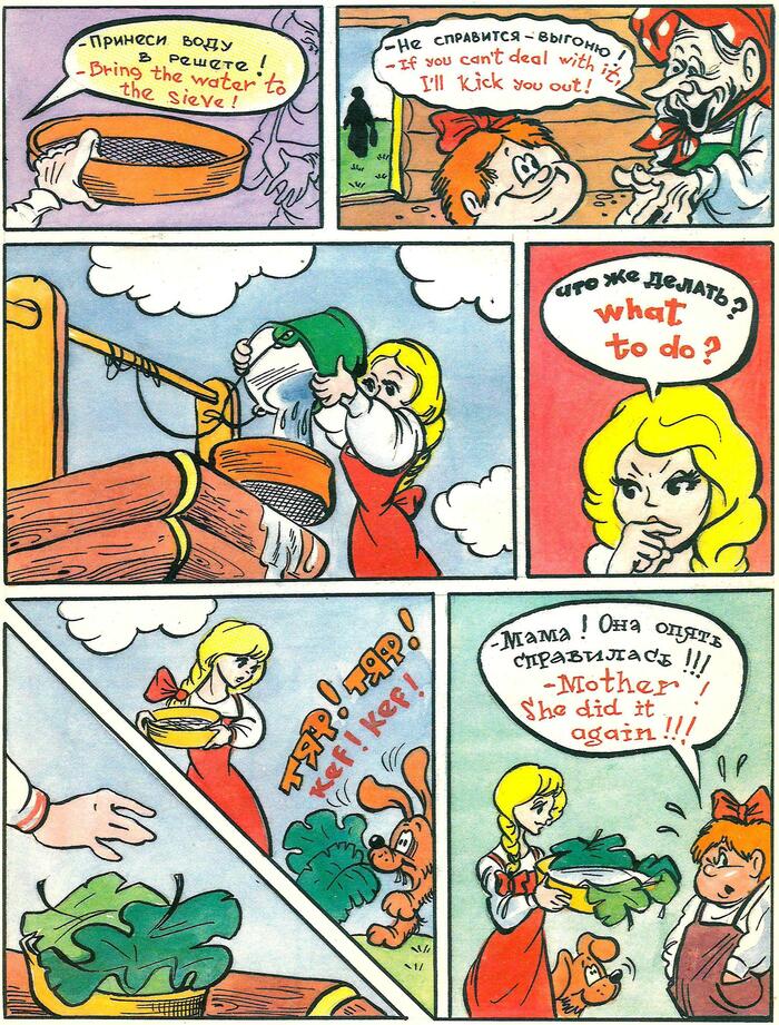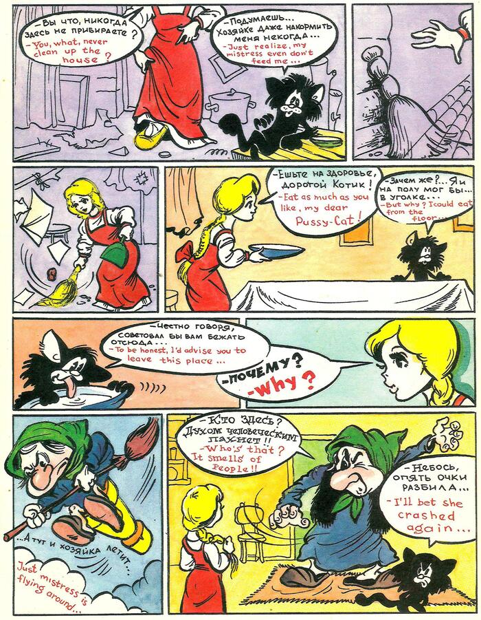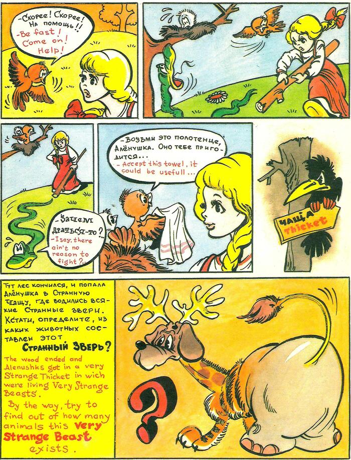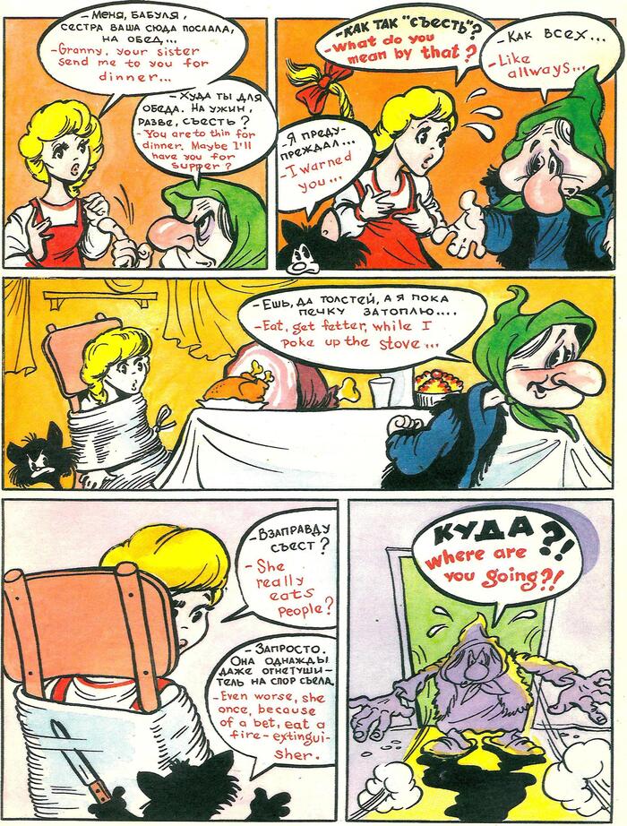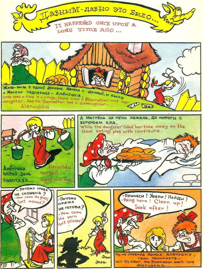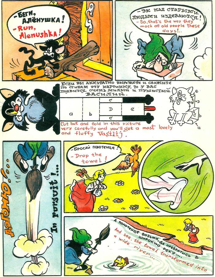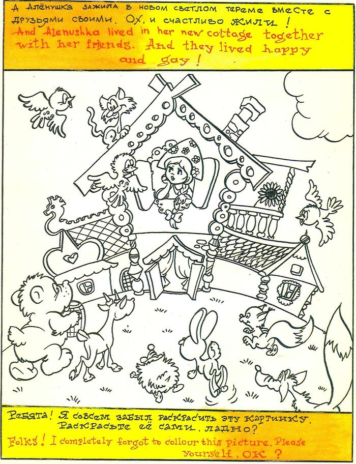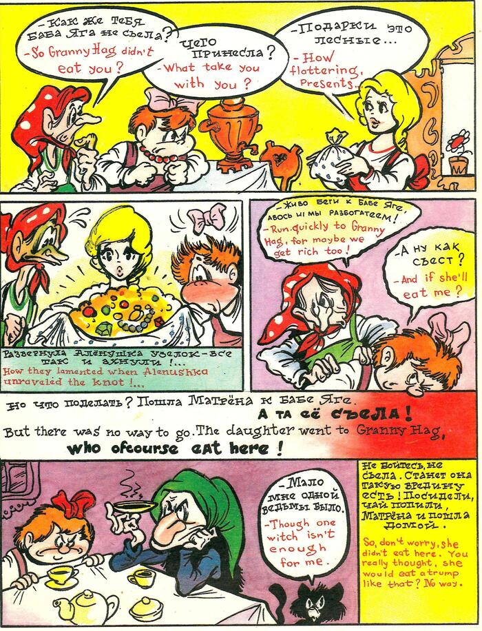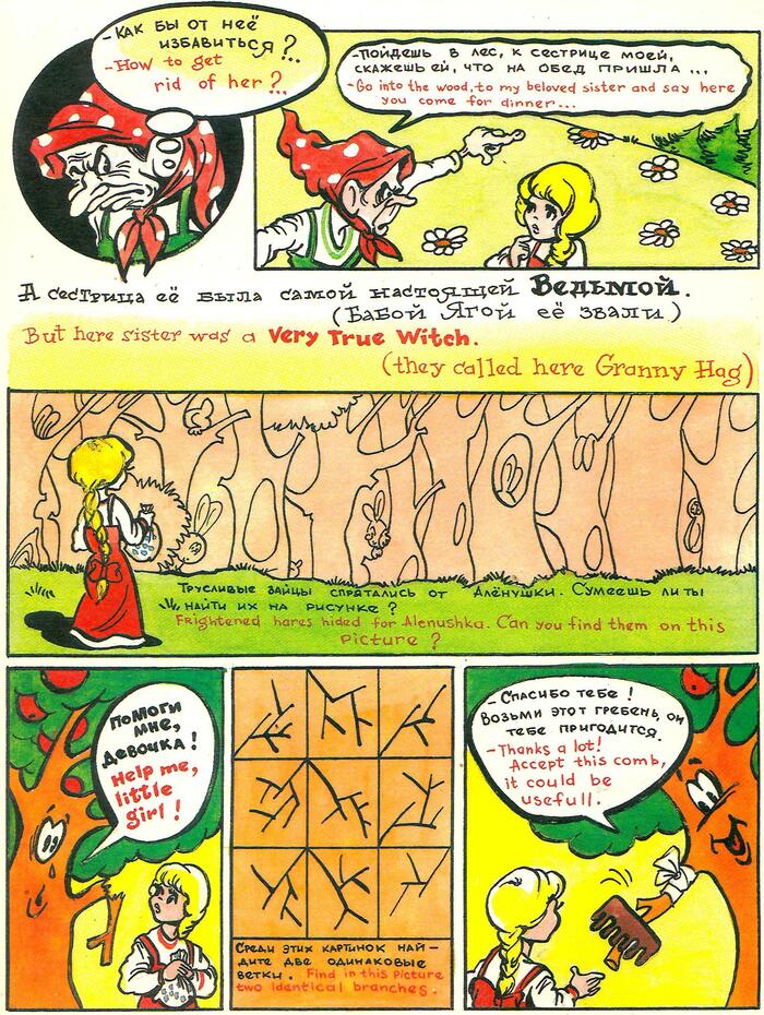 Эта история про Алёнушку и её "вынужденную" родственницу Бабу Ягу. "Сказочная злодейка" пыталась извести девушку, но всё закончилось хорошо, ведь за Алёнушку как флора, так и фауна, включая, даже, и кота самой Бабы Яги. Издания двуязычное (второй язык - английский). Автор текста и иллюстраций - Александр Шахгельдян. Издано "Фирмой "Домино ХХI", по некоторым данным, в 1992 году.