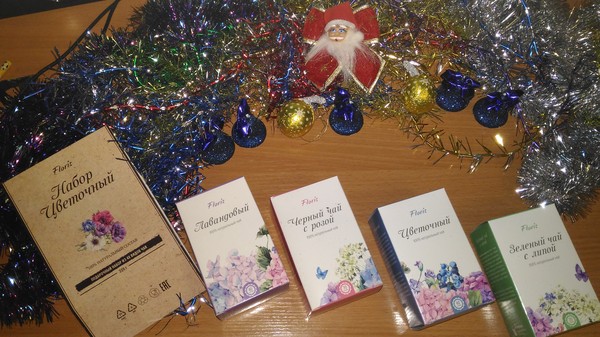 В посылке я получил кучу елочных украшений. А желтые шарики были съедены сразу же после фотосъемки (они были шоколадными). Снегурочка еще прислала мне набор цветочного чая. :)