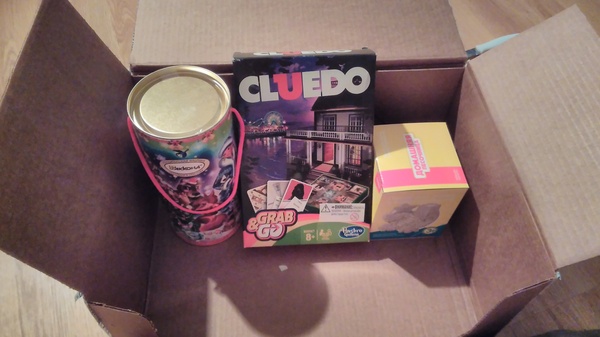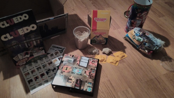 Открыла коробку и обнаружила в ней коробку сладостей кондитерской фабрики Аккорд, что в Чебоксарах находится, домашняя песочница и настольная игра