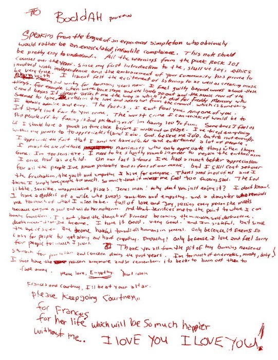 Говоря языком опытного простака, который предпочел бы быть кастрированным, инфантильного нытика. Эту записку будет довольно нетрудно понять. Все предупреждения из 101 урока панк-рока за эти годы. с моего первого знакомства с, скажем, этикой, связанной с независимостью и принятием твоего общества оказались очень правильными. Я уже очень много лет не чувствую волнения, когда слушаю и создаю музыку, а также когда читаю и пишу. Я не могу описать словами, как мне стыдно из-за этого. Например, когда мы за сценой и гаснет свет, и начинается маниакальный рев толпы, это не трогает меня, как Фредди Меркюри, который кажется, любил, купался в любви и обожании толпы. Это то, чем я безгранично восхищаюсь и чему завидую. Факт в том, что я не могу дурачить вас. Никого из вас. Это просто нечестно по отношению к вам или ко мне. Самое худшее преступление, какое я могу представить – это обирать людей, притворяясь, что я веселюсь на все сто. Иногда я чувствую, будто должен запускать таймер перед выходом на сцену. Я пытался сделать всё что в моих силах, чтобы быть благодарным за это (и я благодарен, Господи, поверьте, я благодарен, но этого недостаточно. Я ценю то, что я и мы затронули и развлекли много людей. Я наверно один из тех нарциссов, которые ценят что-то, только когда потеряют. Я слишком чувствительный. Мне нужно стать немного глухим, чтобы вернуть тот энтузиазм, который был у меня когда-то в детстве. Во время последних трех туров я испытывал намного больше благодарности ко всем людям, которых я знаю лично и к фанатам нашей музыки, но я все равно не могу преодолеть раздражение, чувство вины и сострадания по отношению к каждому. Во всех нас есть что-то хорошее и думаю, я просто слишком люблю людей. Так сильно, что мне черт побери очень грустно. Грустный маленький, чувствительный неблагодарный, рыба, человек-иисус! Почему бы тебе просто не наслаждаться этим? Я не знаю. У меня жена-богиня, которая сочится амбициями и сочувствием, и дочка, которая слишком напоминает мне, каким был я сам. Полная любви и радости, целующая каждого встречного, потому что все хорошие и не причинят ей вреда. И это ужасает меня до такой степени, что я едва могу что-то делать. Мне невыносимо думать, что Фрэнсис станет таким же жалким, разрушающим себя дэт-рокером, каким стал я. В моей жизни есть хорошее, и я благодарен, но с семи лет я стал ненавидеть все человечество в целом. Только потому, что людям кажется так легко ладить друг с другом и иметь сочувствие. Сочувствие! Думаю, только потому, что я люблю и сочувствую людям слишком сильно. Спасибо вам всем из глубины моего горящего больного желудка за ваши письма и заботу за последние годы. Во мне слишком много от непостоянного капризного ребенка! Во мне больше нет страсти, поэтому помните: лучше сгореть, чем угаснуть.