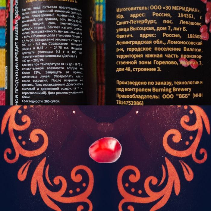 Состав: вода, солод, плодово-ягодное сырьё, пряно-ароматическое сырьё, хмель, дрожжи.