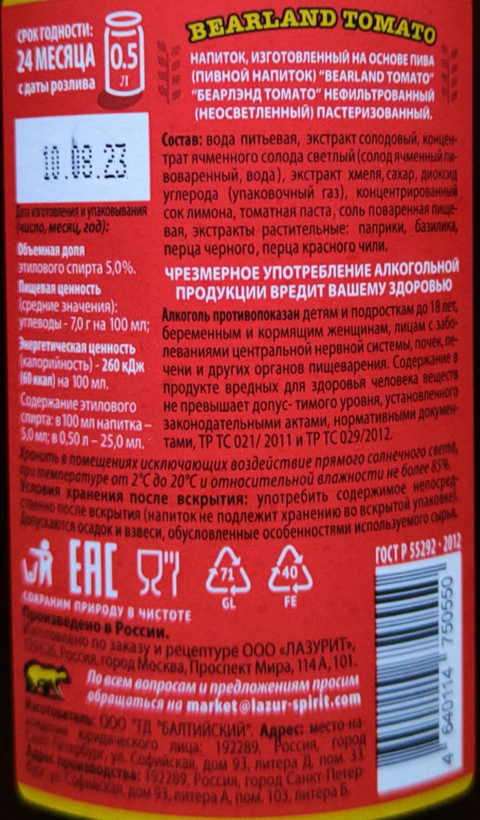 Состав: вода, солод, томатная паста, хмель, пряно-ароматическое сырьё, дрожжи.