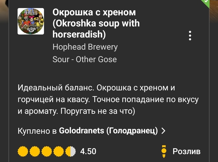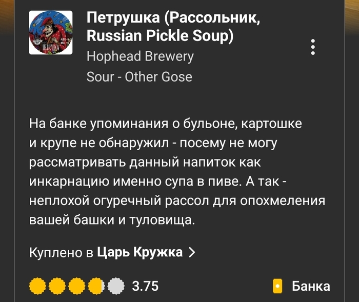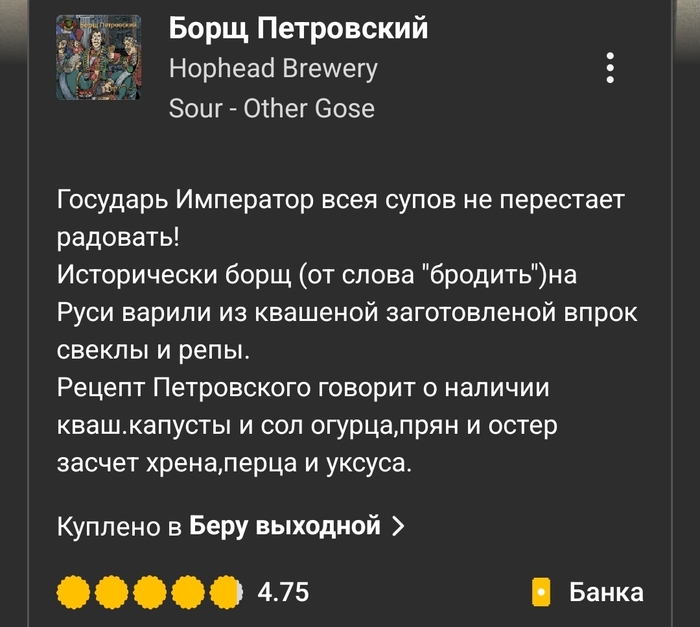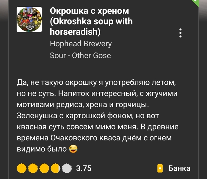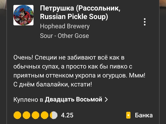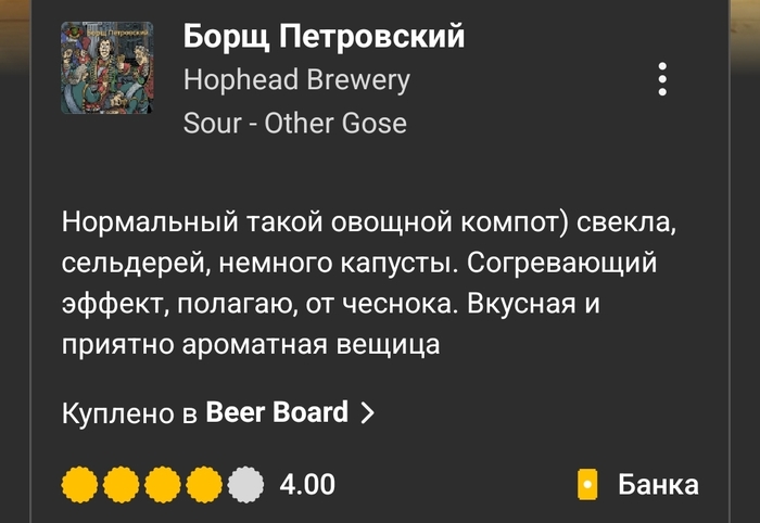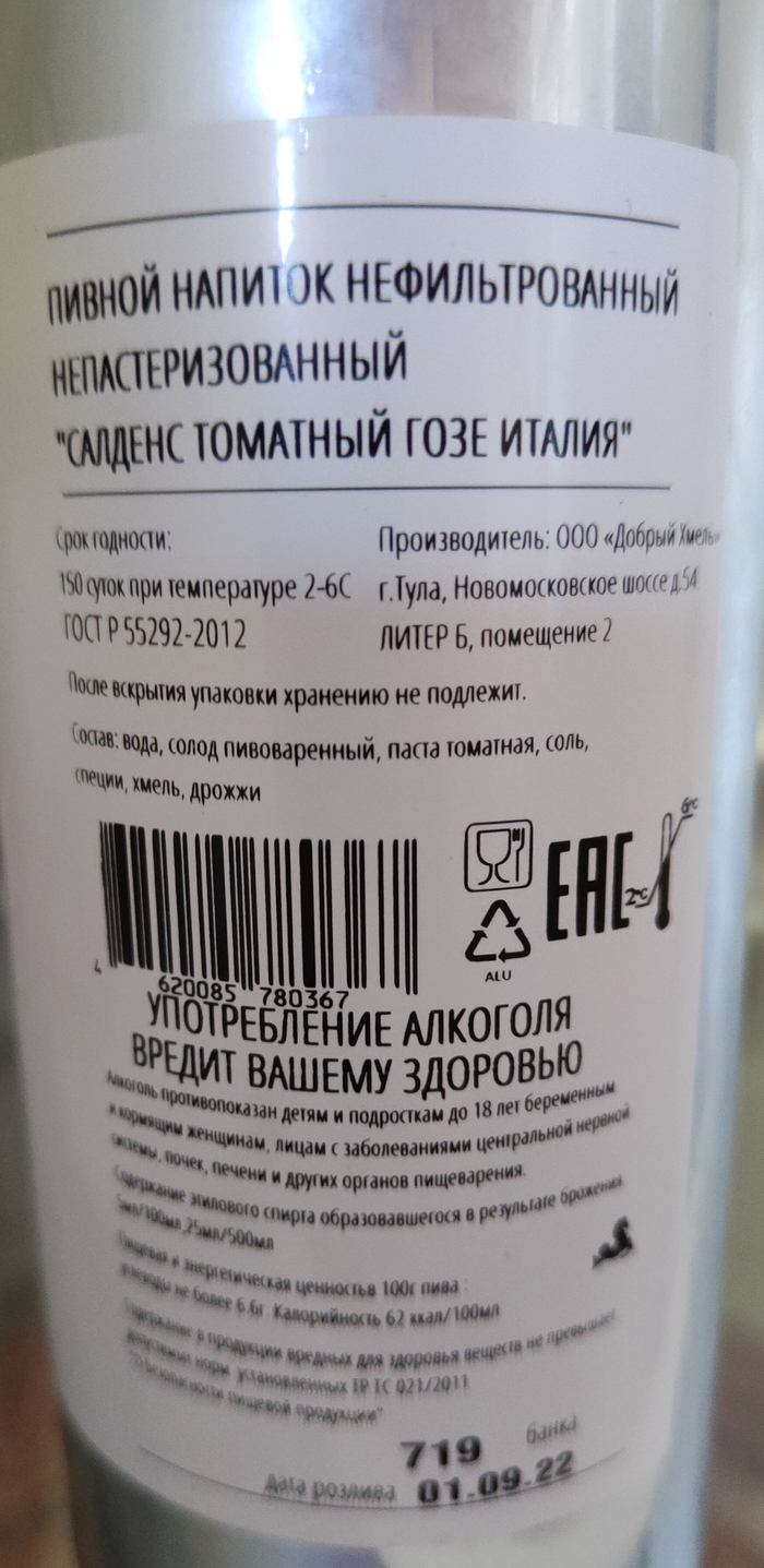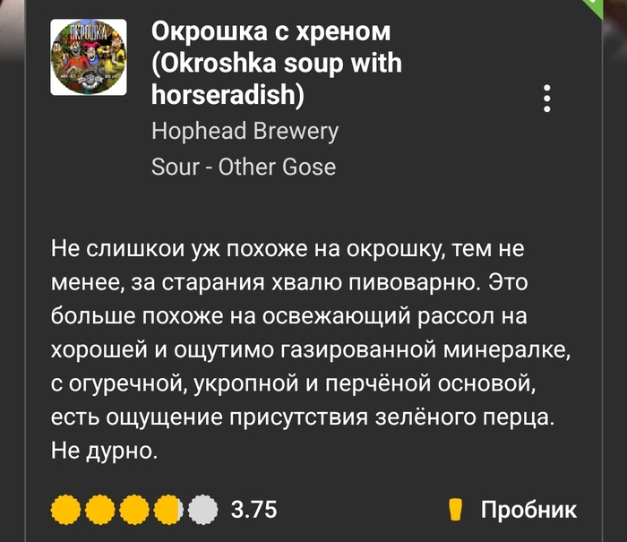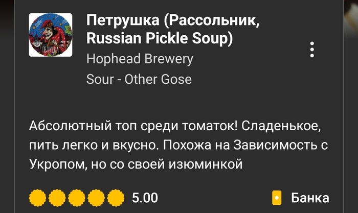 Вердикт: питкий и приятный гозе с насыщенными томатными, чесночными, пряными и копчёными оттенками. Острота в меру.