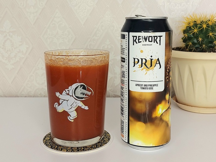 "Мы часто говорили о том, что простые томатки нагоняют на нас зевоту и тоску. Ну хотя бы просто потому, что они простые. А мир наш немножко сложнее бокала «Кровавой Мэри». Сложнее, ярче и многограннее. Возьмите хотя бы ту же азиатскую кухню, не псевдояпонские роллы с мазиком и копченой курицей (где-то сейчас не дрогнув глазом сделал харакири самурай) а настоящую, подобную алмазу огранки Толковского, где воедино смешиваются все пять вкусов, но не для того, чтобы стать бессмысленной мешанной, а для того, чтобы каждый последующий подчеркнул достоинства предыдущего, замкнувшись в итоге в кольцо, словно кулинарный Уроборос. Именно поэтому в новом томатном гозе Pria нет банального набора итальянских трав или прованских специй, но есть яркая игра спелого, с бодрящей кислинкой, ананаса и сочного, сладкого абрикоса, впитавшего в себя все солнце мира. Сладость, кислинка, легкая горечь, деликатная соленость базы и, разумеется, умамность томата — вот они, все пять, как один, дергай кольцо банки и ныряй!"