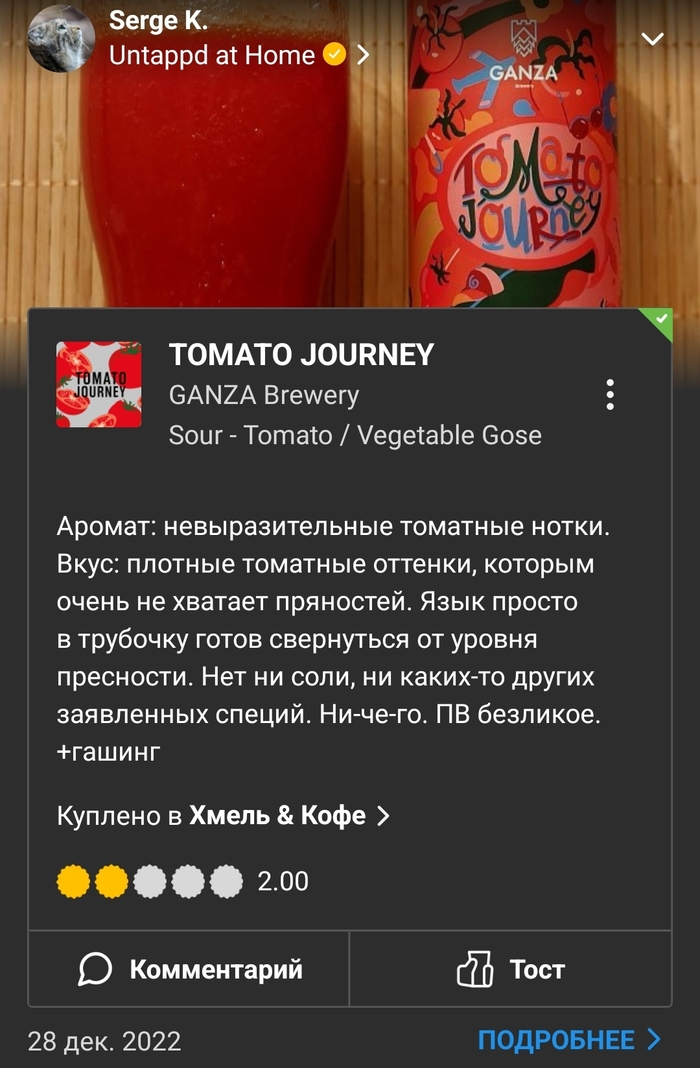 Любителям томатных гозе из категории "шоб вставило" Kimjang определённо понравится, но для обывателей он покажется чрезмерно острым. К слову, в Untappd больше всего отзывов именно об этом.