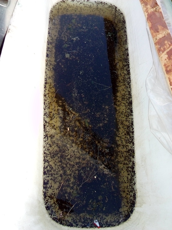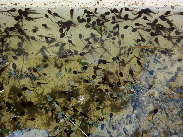 В деревне лягушка отложила икру в канаву. А канава пересыхает часто. Пришлось переселить в ванну, (деревянный чопик в слив забил) вот результат спустя неделю: