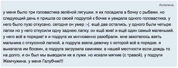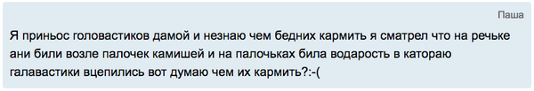 Как вы видите, нихуя не изменилось. Белая херня на видео под водой на 4-5 секунде - это я сметаны им кинул, вроде жрут. Ждите отчета через несколько дней, если вам это вообще нужно. У меня своих дел хватает, я тут работу сейчас ищу, блеать. Ряску не нашел, топал до заброшенного колодца, а там пусто.