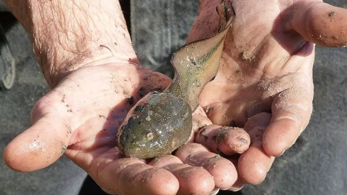 Но самый большой головастик — не результат видовой особенности, а плод генетической ошибки. Знакомьтесь, это Голиаф — самый большой головастик в мире. Это дитятко лягушки-быка из Северной Америки. Малышей этого вида и без того крохами не назовёшь, в среднем головастики лягушки-быка вырастают до 15 сантиметров. Но из-за генетической особенности Голиаф навсегда остался в детском обличье! На протяжении 3 лет он ел и рос, рос и ел, и в итоге вымахал до размеров банана!