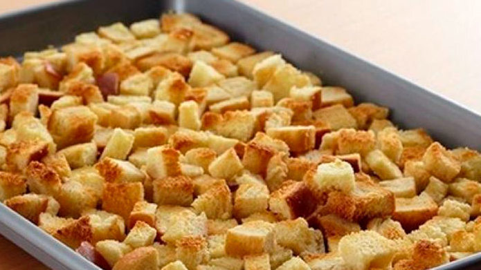 Далее нарезаешь батон кубиками и отправляешь в духовку, с целью подсохнуть и превратиться в слегка поджаристые сухари.