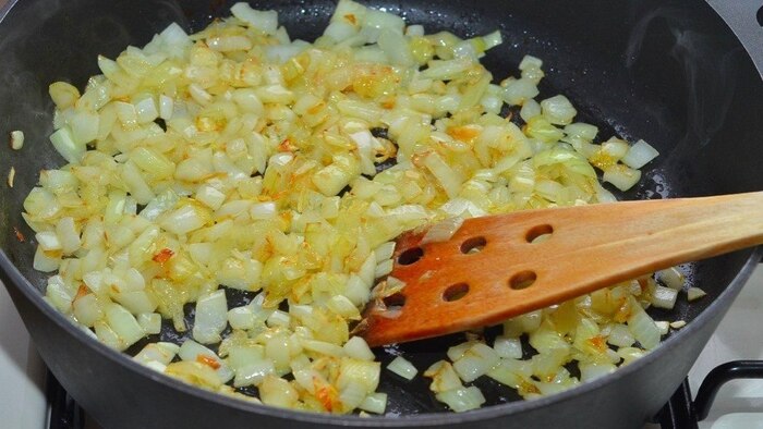 Итак: мелко режешь четыре луковицы.