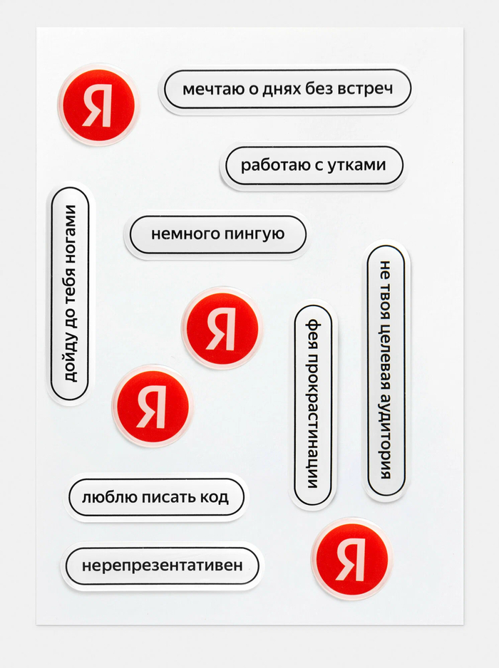 Стикерпак из серии «Я на работе». В наборе 12 наклеек: восемь шутливых и знаковых фраз от сотрудников больших компаний и четыре Я, чтобы собирать комбинации. Наклейки помогут привлечь внимание, прояснить рабочие моменты и найти общий язык с коллегами.
