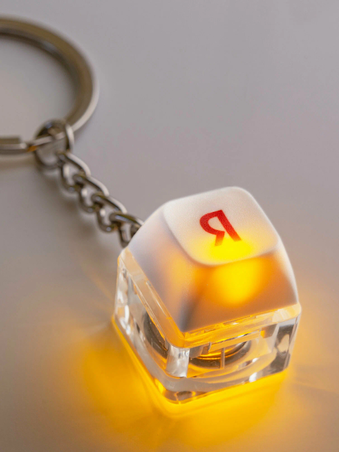 Внутри клавиши синий свитч: механический переключатель с тактильной отдачей и кликающим звуком. Кейкап-колпачок съёмный — его можно надевать на другой похожий брелок или использовать прямо в клавиатуре. Основание кнопки полупрозрачное, усиливает эффект свечения при клике. У брелка есть кольцо на цепочке, чтобы прицепить его и носить всегда с собой.