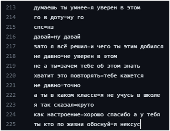 Чтобы помощник мог разговаривать с пользователем, ему нужно знать, что ответить. Скачал несколько готовых баз для чат-ботов, объединил, адаптировал. Получилась система вопрос-ответ. Тупенькая, но для начала пойдет. Объем 78.000 пар вопрос-ответ. С этим помощник сможет хотя бы более-менее осмысленно отвечать на вопросы, и это полностью локально. А беседы я с ним водить и не собирался.