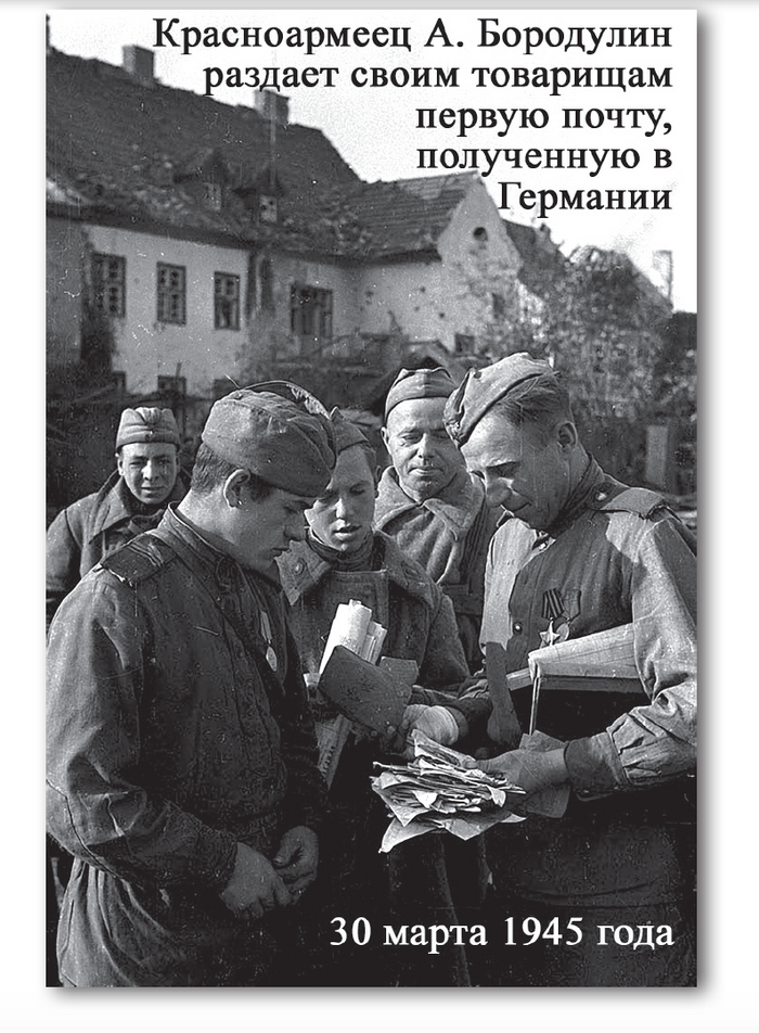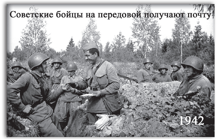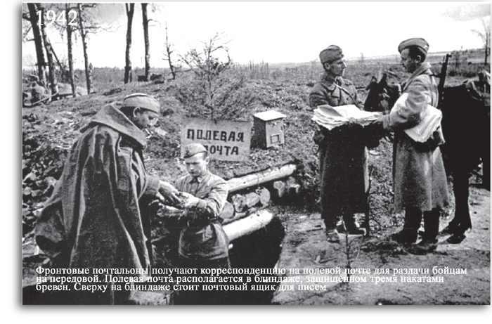 …На фронте писем из дома ждали с не меньшей силой, чем с фронта. Письмо из дома с коротким адресом: «Полевая почта… и фамилия» на фронте было гораздо важнее, чем еда или концерт. Для почты выделяли и использовали всё, что могли, весь имеющийся транспорт: почтовые вагоны, корабли, почтовые самолёты, автомобили, мотоциклы. В Севастополе, например, для почты использовали субмарину.