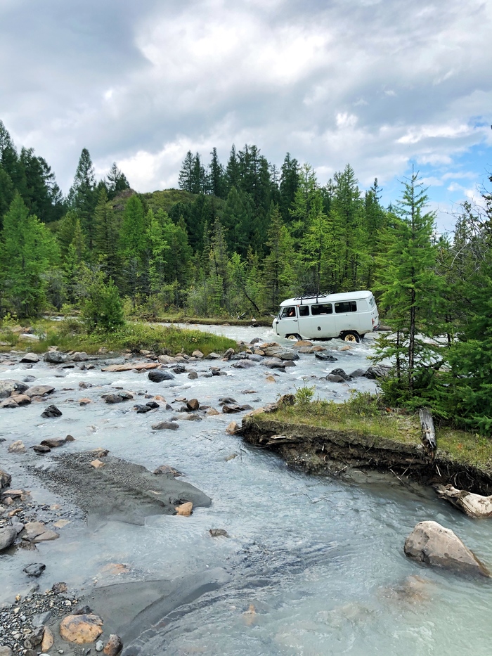 Мы сели обратно, казалось, что это был сложный участок, но дальше дорога была еще хуже, серпантин, лес, грязь, колеи и огромные валуны, теперь все это было вместе. Машину трясло во все стороны, она издавала металлический скрежет и, казалось, вот вот развалится на части, но этого не произошло. Нас в это время кидало по салону как в том самом видео, ведь в этих буханках совсем не предусмотрены ни ремни безопасности, ни ручки, чтобы было за что держаться. Когда эта ужасная дорога закончилась, мы выехали в огромное русло горной реки, сейчас река представляла из себя только маленькие ручейки, стекающие по гальке, в некоторых местах вода текла по колее, оставленной машинами, а мы ехали прямо по руслу вверх по реке. Потом был еще один небольшой участок такой же страшной дороги, и мы приехали на место.