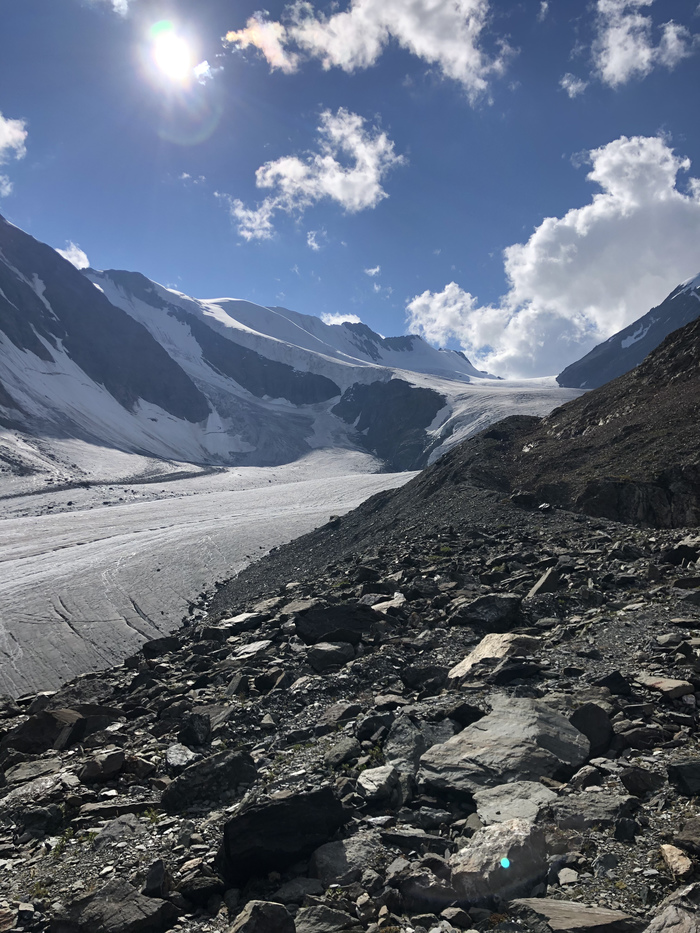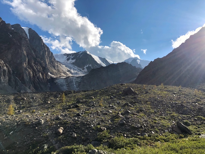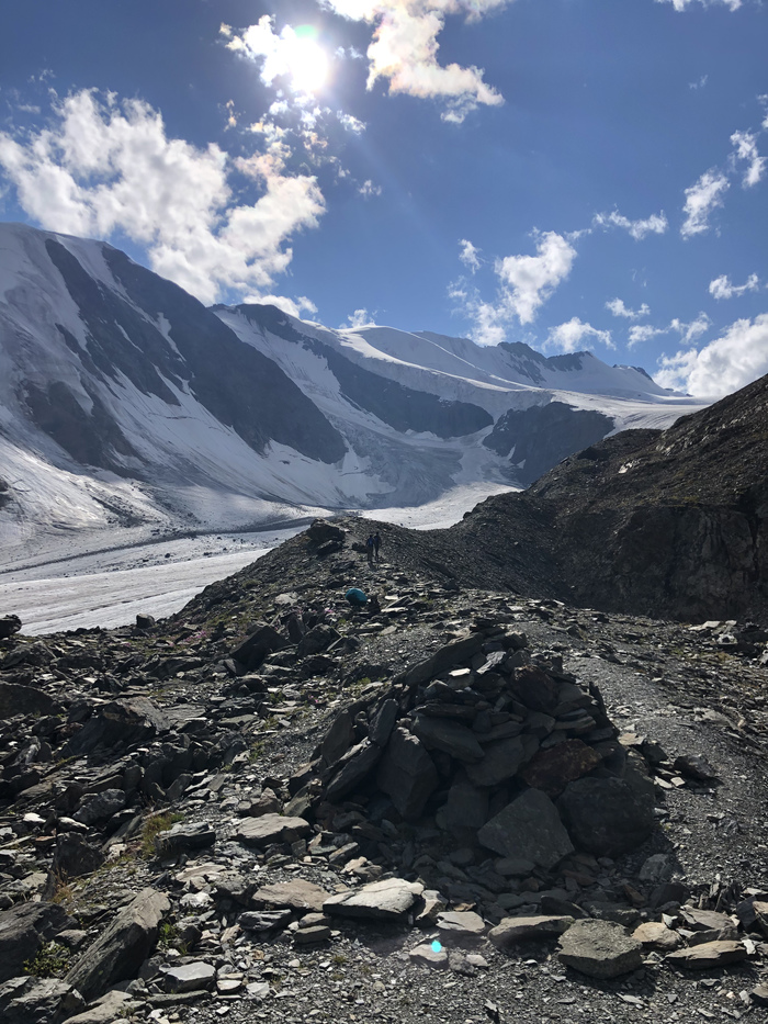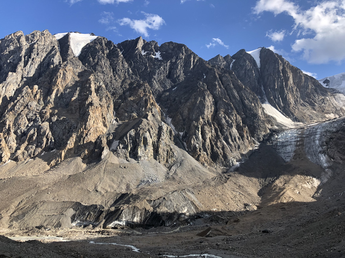 Тут открывается один из лучших видов. Слегка заснеженные вершины и стекающий с них ледник.