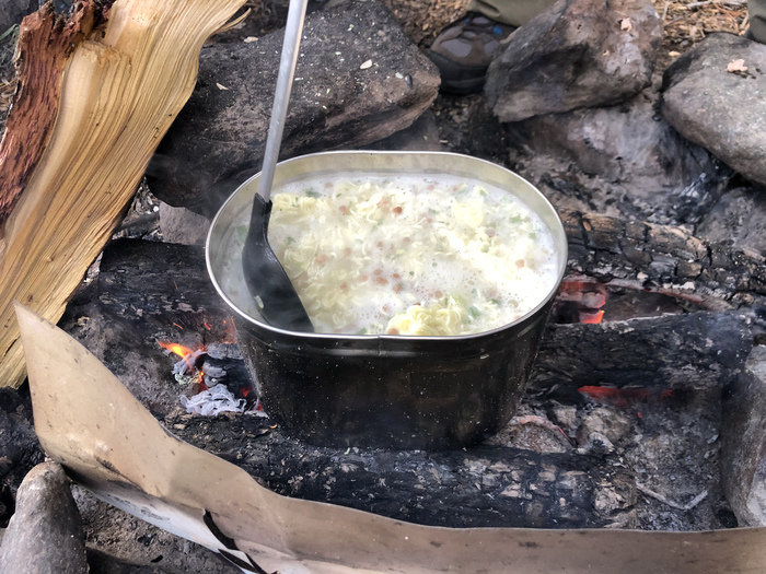 А нет, это оказался один из нас, просто за время в горах мы стали напоминать бомжей и оголодали. Ингредиенты были найдены и отправлены в котелок, и вот что получилось: