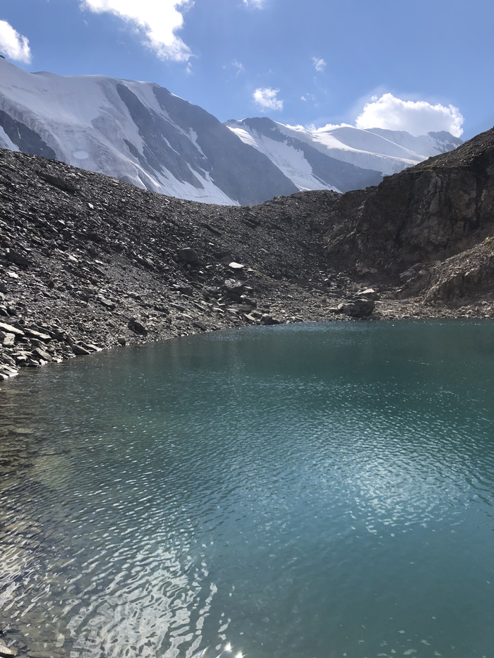 Дальше путь ведет нас через малое озеро, размеры его правда небольшие, ну может метров 10-15 в диаметре, зато с этого места уже открывается отличный вид на ледник, который является целью похода. Немного спуститься вниз, пройти по тропинке, и вы уже у самого ледника. Ледник не такой белоснежный, как видимые за ним вершины гор, он покрыт землей и камнями, но все равно очень впечатляет, размеры его колоссальны. По бокам от ледника текут ручьи, порожденные его таянием.