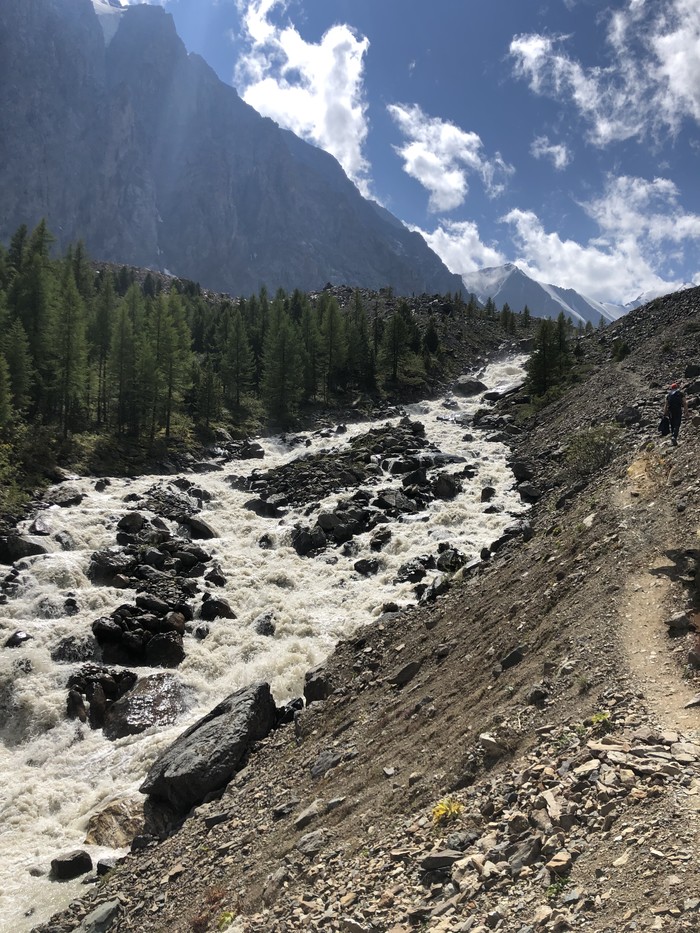 После обеда мы отправились в первый наш большой поход на большой ледник. Погода была теплая, на базе комфортно можно было находится в футболке и шортах, но на леднике предполагалось, что будет холодно. Я оделся в спортивные штаны, трекинговые ботинки, футболку, а с собой взял флиску, шапку и теплую горнолыжную куртку. Комплект остальных не сильно отличался от моего. Так мы выдвинулись в путь, найти дорогу нам помогало приложение MapsMe, на котором отмечены не только дороги, но и всевозможные тропинки и маршруты. Сначала нужно было перейти тот самый мост через реку, а потом направиться в лес. Немного пройдя по лесу вдоль реки, нужно будет пересечь реку, моста уже не будет, но было достаточно мест, где это можно сделать.