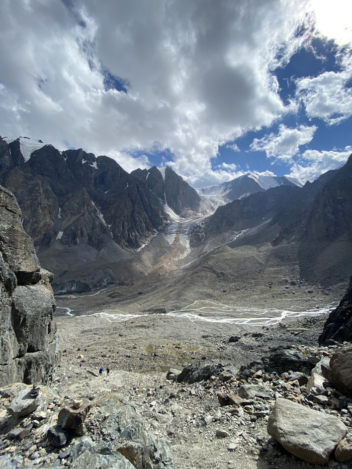 Казалось бы, что цель достигнута, но это не конец маршрута, осталось посмотреть еще большое озеро, оно находится чуть выше по склону. Дорога до озера идет воль ледника, но на возвышенности, крутой обрыв слева ведет прямо в ручьи ледниковой воды. Этот участок был особенно сыпучим, камни постоянно вылетали из-под ног. Еще минут 20 пути, и мы дошли до озера. Большое озеро расположилось в углублении, образовавшемся на горе, и питалось из белоснежных горных ледников, потому вода была довольно прозрачной. Не сказать, что физически весь подъем был очень сложен, но проблемы терморегуляции усложняют его в разы, тебе и жарко, и холодно, приходится выбирать, либо потеть в куртке, либо замерзнуть и простудиться. Дойдя до большого озера, вся наша одежда промокла насквозь. Да и при постоянно потении, организм устает значительно быстрее, так что мы устроили привал с отдыхом. Вода, которую мы взяли с собой, давно закончилась, а бутылки остались. Мы спросили у группы людей, разбивших палатку прямо у озера и похожих на спасателей, где можно набрать воды, и они указали нам на противоположную сторону озера, утверждая, что там есть чистые ручьи. Озеро находилось в углублении и было немного прикрыто от холодных ветров, а солнце пекло и там было довольно жарко. Я решил спрятаться за камнями и посушить сначала промокшую куртку, а потом надеть куртку и посушить футболку с флиской. Затея прошла успешно, солнце жарило достаточно, чтобы это провернуть. А потом, оставив часть группы отдыхать, мы втроем отправились искать чистый ручей. Идти надо было вдоль берега озера, никакой тропинки там не было совсем, нужно было ползти по огромным валунам. Это заняло немного времени, но мы доползли до ручья, вода в котором была очень прозрачной и ледяной, там мы и набрали наши бутылки. У нас было с собой примерно литров 5 на 7 человек, этого было мало, учитывайте в своих планах, но на вершине можно будет пополнить запасы. Стоит так же учесть, что не все доходят до вершины, по пути мы встретили пару развернувшихся групп туристов. Но не пугайтесь, ничего сложного в маршруте нет, но лучше взять больше запасов и выйти пораньше, чтобы не так торопиться, как мы, мы вышли уже после обеда и нужно было успевать вернуться до заката, ведь в темноте там не видно вообще ничего. А вот самые сочные фото ниже.