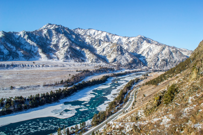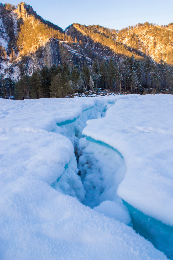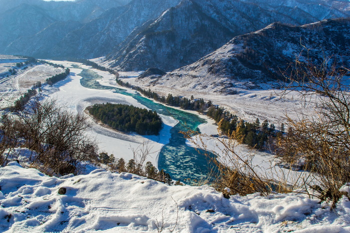 Ну и финальная точка маршрута - Голубые озёра. Это группа озёр расположена в русле реки Катунь, к северу от села Аскат. Образуются они в осенне-зимний период, в результате падения уровня реки. Замерзать им не дают многочисленные родники. Глубина озёр достигает 8 метров. Зимой на берегу организуется передвижная платная баня.