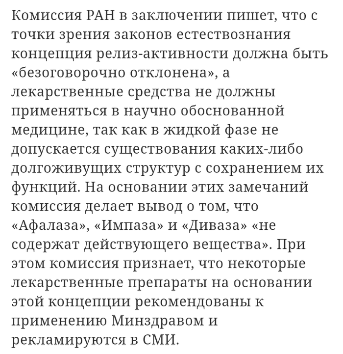 Дальше. Близкая ситуация сложилась вокруг нашего меморандума о гомеопатии. Для любого физика и химика, в общем, достаточно ясно, что положения этого меморандума не вызывают никаких сомнений. Но после слияния с Медицинской академией наук в руководстве РАН появились адепты гомеопатии. Вот, в частности, цитаты из выступления академика Сергея Колесникова. Он публично дезавуировал наш меморандум и написал: «Удивляет перечень “экспертов”, поставивших подпись под меморандумом. Большей частью это люди, не имеющие отношения ни к медицине, ни к комиссии по лженауке. Среди них есть лоббисты “большой фармы”».