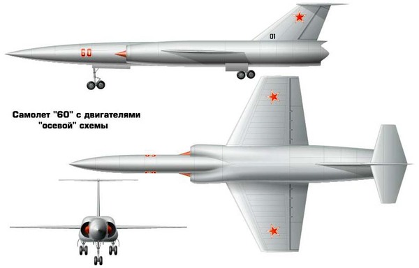 Первым в СССР самолетом с атомным двигателем должен был стать бомбардировщик М-60, разрабатываемый на основе существующего М-50. При условии создания двигателя с компактным керамическим реактором, разрабатываемый самолет должен был иметь дальность полета не менее 25 тыс. км при крейсерской скорости 3000−3200 км/ч и высоте полета порядка 18−20 км. Взлетная масса супербомбардировщика должна была превысить 250 т.