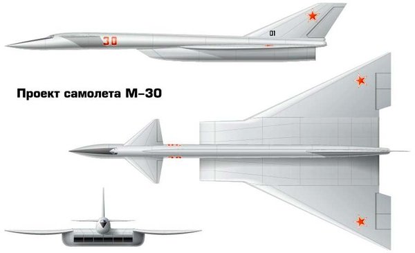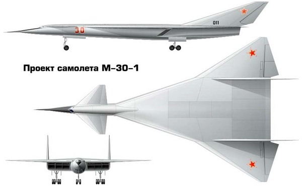 Разработка двигателя для нового самолета была поручена ОКБ Кузнецова. При проектировании конструкторы столкнулись с неприятным парадоксом — падением тяги атомного двигателя с понижением высоты. (Для обычных самолетов все было в точности наоборот — тяга падала с набором высоты.) Начались поиски оптимальной аэродинамической схемы. В конце концов остановились на схеме «утка» с крылом переменной стреловидности и пакетным расположением двигателей. Единый реактор по мощным замкнутым трубопроводам должен был доставлять жидкий теплоноситель (литий и натрий) к 6 воздушно-реактивным двигателям НК-5. Предусматривалось дополнительное использование углеводородного топлива на взлете, выходе на крейсерскую скорость и выполнении маневров в районе цели. К середине 60-го года предварительный проект М30 был готов. В связи с гораздо меньшим радиоактивным фоном от новой двигательной установки, существенно была облегчена защита экипажа, а кабина получила остекление из свинцового стекла и плексигласа общей толщиной 11 см. В качестве основного вооружения предусматривались две управляемые ракеты К-22. По планам подняться в воздух М-30 должен был не позже 1966 года.