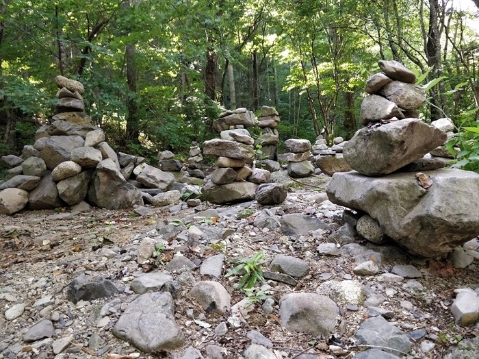 По пути встретилась полянка со скульптурами из камней - на некоторых из них лежали всякие мелкие безделушки и сладости. Мы решили, что это подношения духам :)