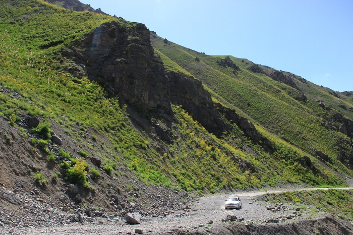 Местами еще сохранился асфальт, но большей частью все засыпано щебнем, который сыпется со склонов. Но наша машинка медленно ползет вверх.