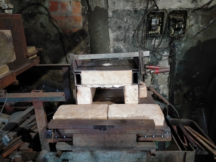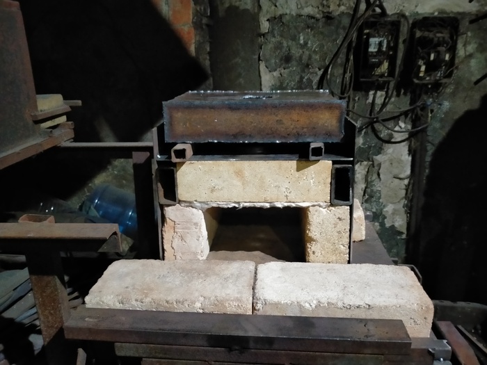 Не стал заморачиваться с дверками и всякими прочими шторками. При работе оказалось намного удобнее регулировать закрытость камеры горна просто кирпичами.