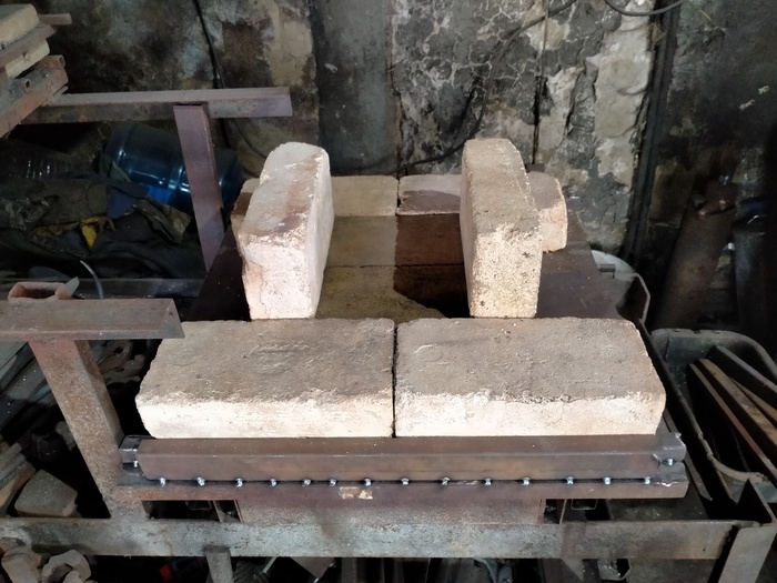 Так же склеиваем 2 кирпичика, сверлим отверстие под форсунку (для защиты кирпича от высокой температуры снизу приклеиваем кусочек огнеупорной ваты мкрр-130), собираем, зажимаем железом и обвариваем. В принципе всё. Горн готов, ставь форсунку и можно работать...